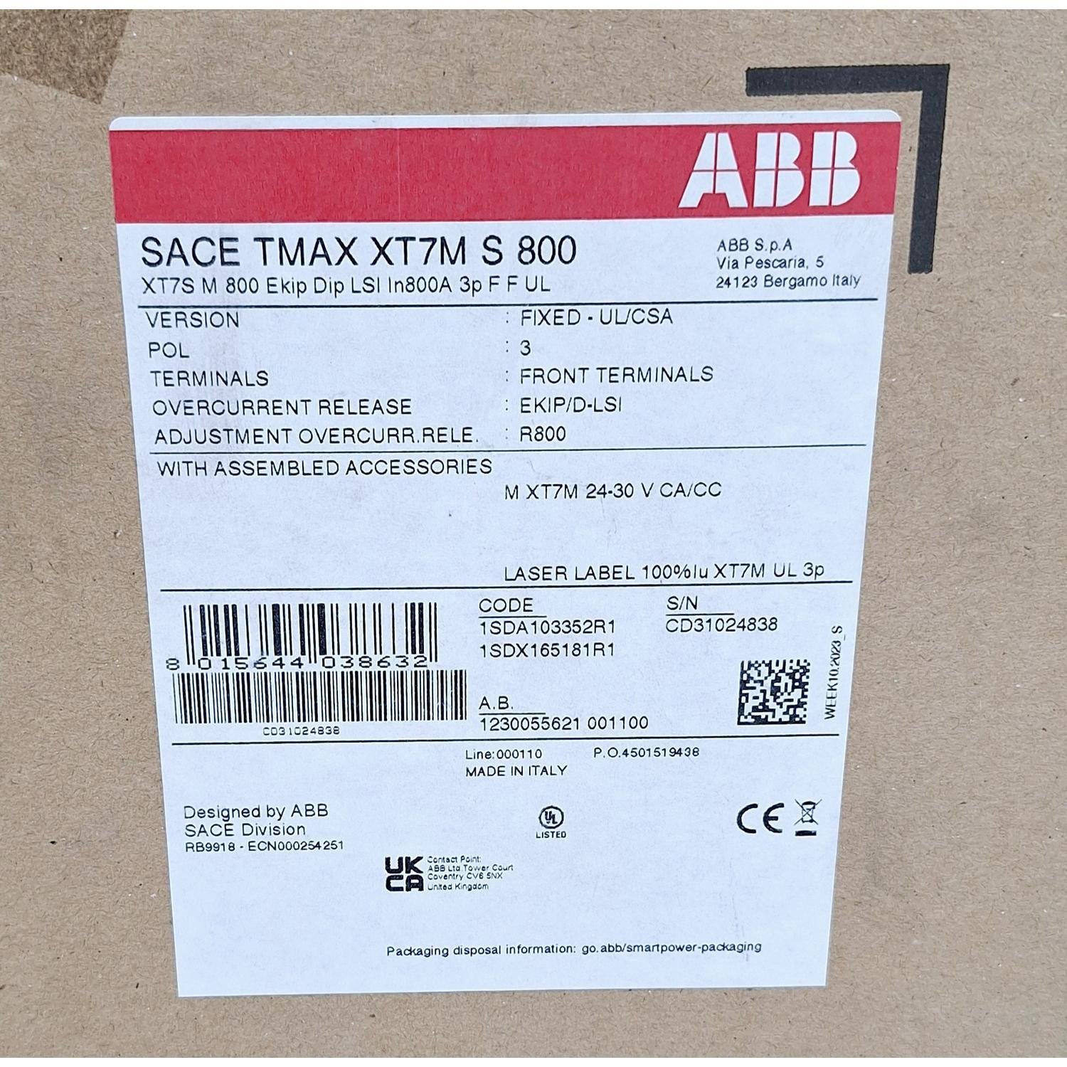 ABB SACE TMAX XT7M S 800 Ekip Dip LSI Circuit Breaker 800A 3P
