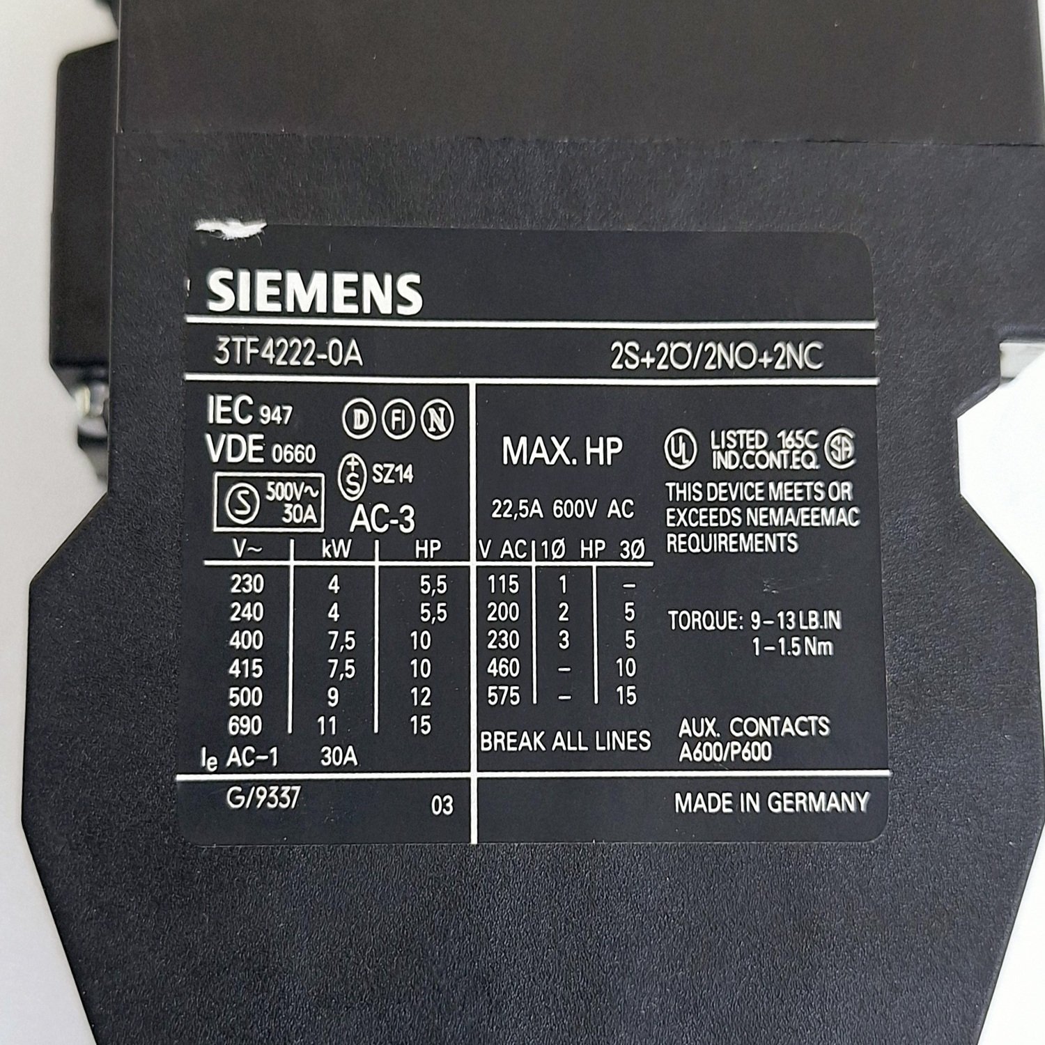 Siemens 3TF42 22-0AP0 Contactor AC-3: 7.5 KW 380V
