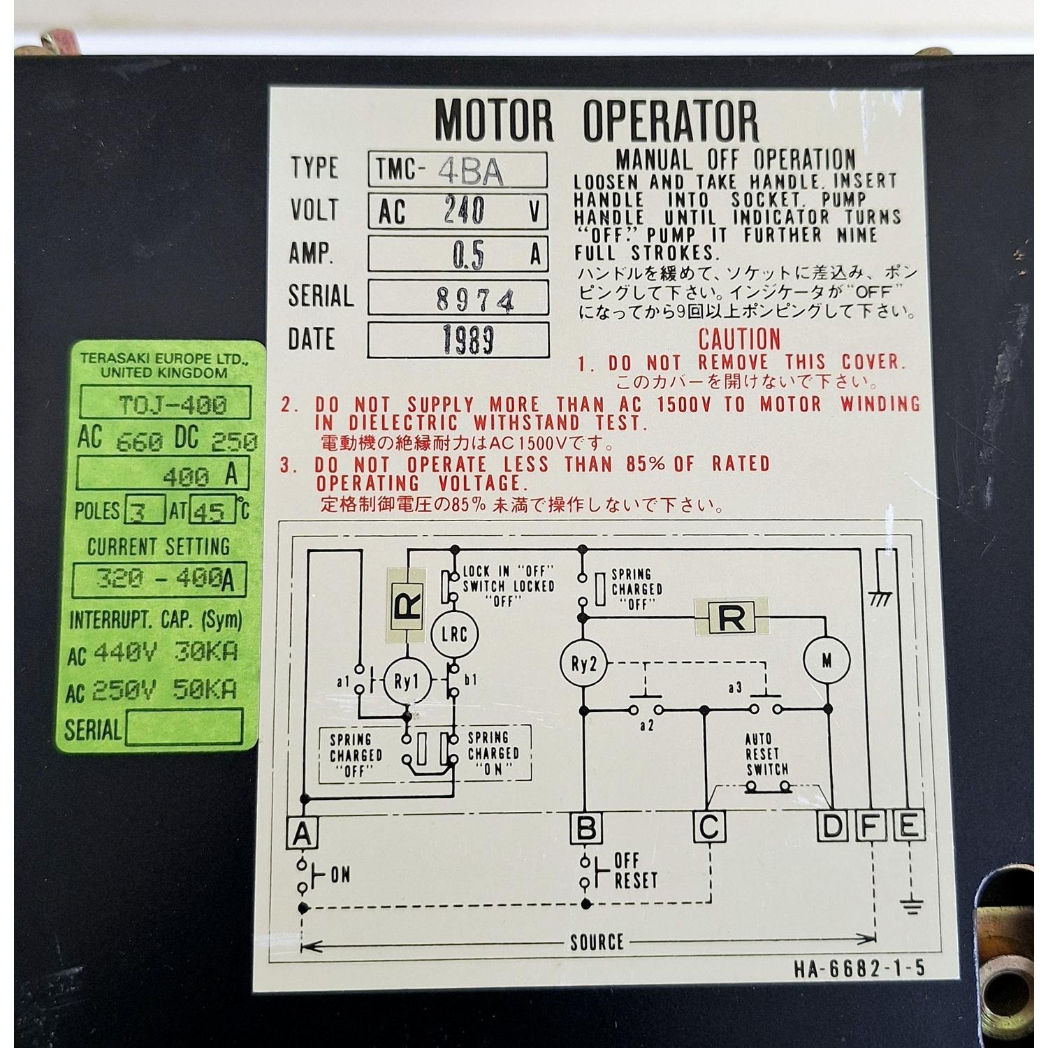 Terasaki TMC-4BA / TOJ-400 Motor Operator Circuit Breaker 240VAC 0.5A