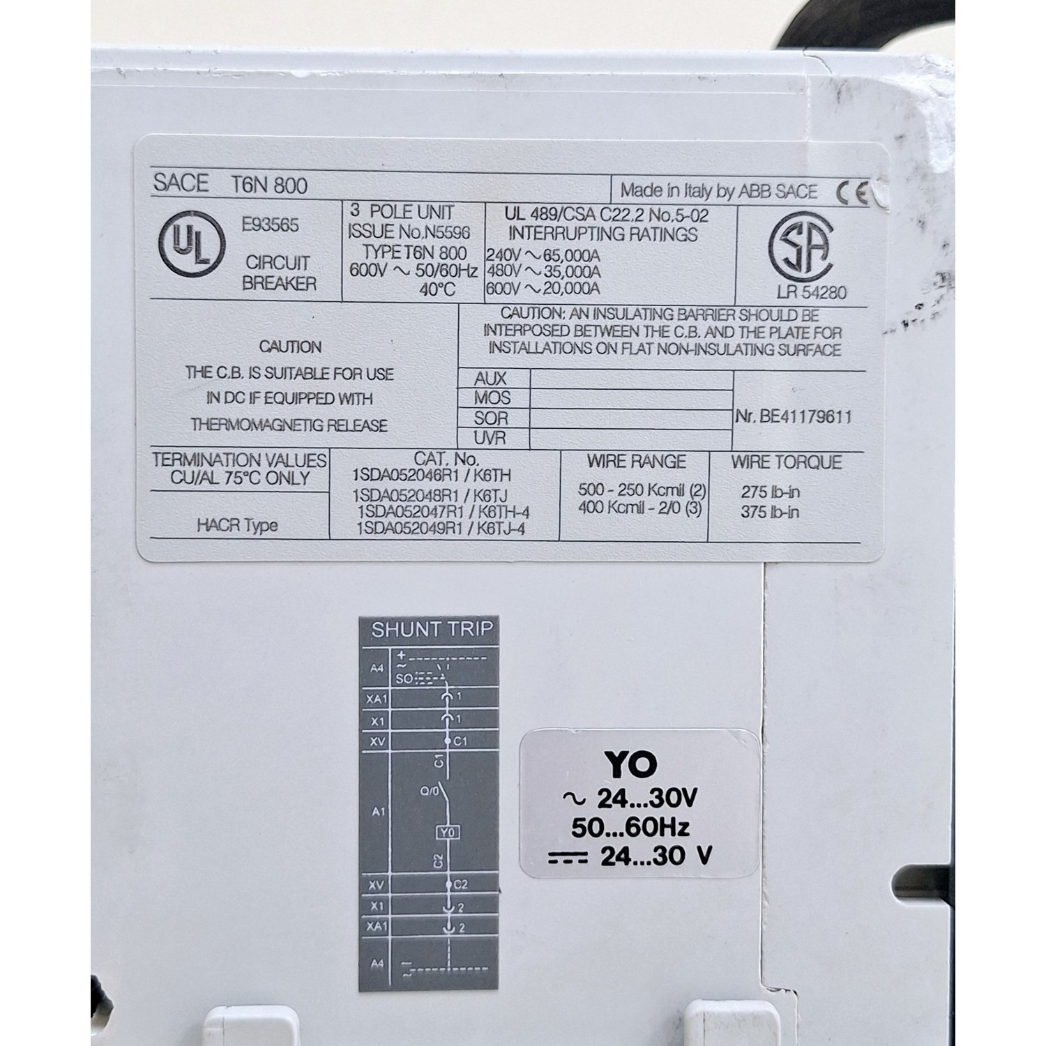 ABB T6N 800 SACE Tmax Circuit Breaker 600V 5060Hz